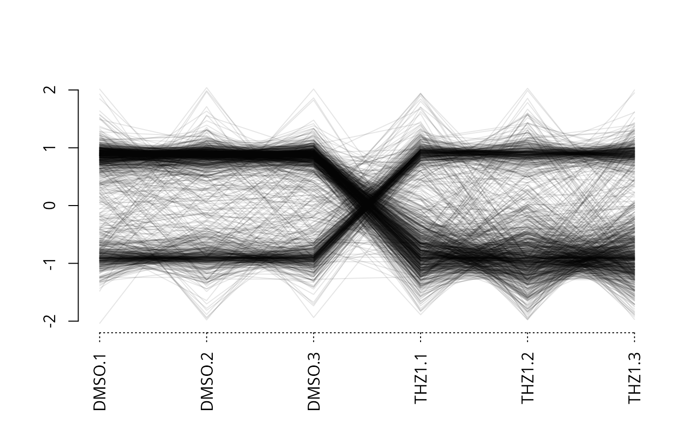 Create a parallel coordinates (scaled expression data on y-axis, samples on x-axis) for a matrix of data.